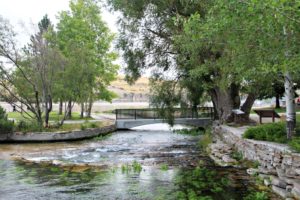 In Great Falls, Montana, the Roe River bubbles out of Giant Springs and flows roughly 200 feet into the Missouri River. I had somehow missed this on my big 2016 adventure, so I was determined to see it when Pat and I returned in 2017!! (Many of you saw it back then also, as part of one of my River Blogs.) In the picture above, taken just above the Springs on Aug 7, 2017, one can see all the way ‘downriver’ to the Missouri in the background! The interpretive signs claim it’s ‘one of the shortest rivers’ in the country flowing into the longest. For more interesting pictures and more information on the Springs & the river, including a description from William Clark’s journal, see RoeRiver.GreatFalls
