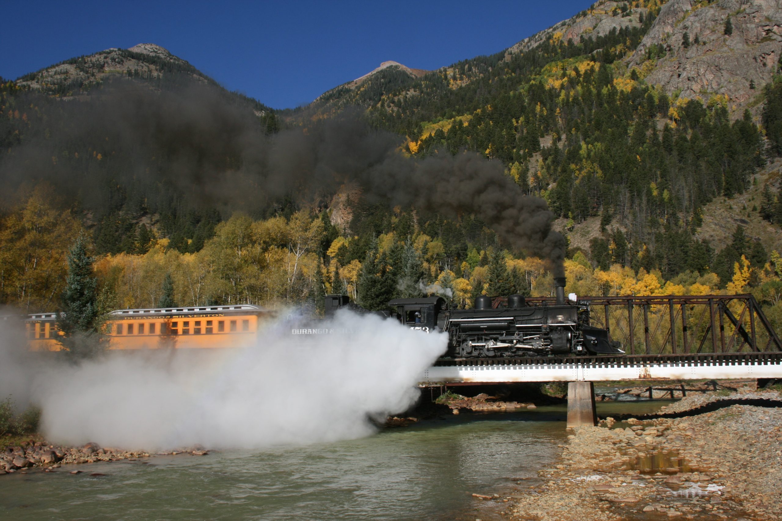 What a beautifully scenic 48-mile journey from Durango to Silverton Colorado, especially  in October!  Quite the variety of views on the journey through the foothills and mountains of Colorado.  And on an old narrow gauge railroad, steam engine and all!  Taken in October, 2015.*  (You can get a glimpse of the beautiful aspens here, but only a glimpse.  For more aspens and a different view, click here. )