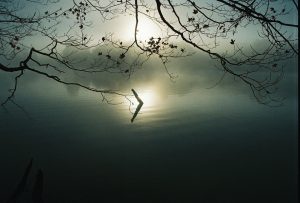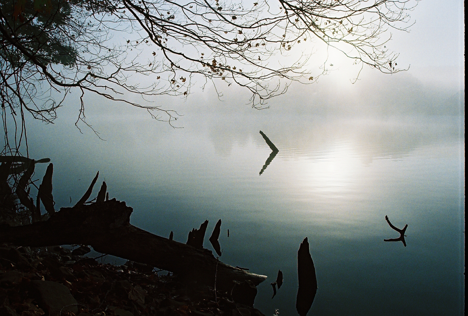 On a foggy autumn morning in October 2006, I wandered down by the lake trying to capture the mood of the fog on the lake (see one attempt here).  Suddenly the sun broke through in a narrow focus on a protuding piece of driftwood.  I’ve always kinda liked the effect.  (Of course, the math type in my also sees a ‘greater than’ sign, but I won’t mention that.)