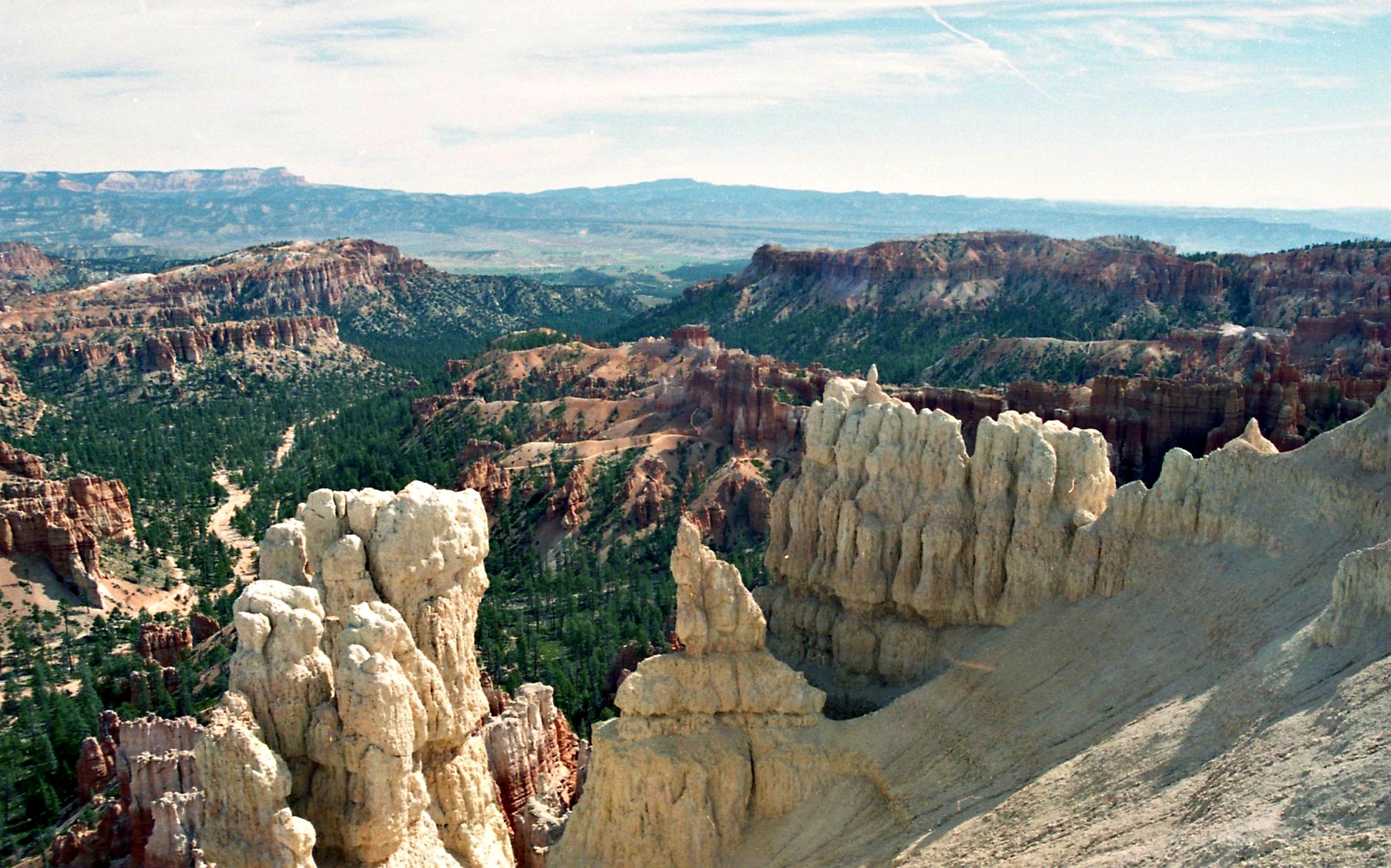 Vast, majestic, beautiful – and full of these ‘hoodoos’, stalagmite-type rock ‘growths’ that often make the canyon look like a cave with no roof!   Taken in September 2005.  For another view of the variety (and denseness) of the canyon and the hoodoos, see Bryce2.