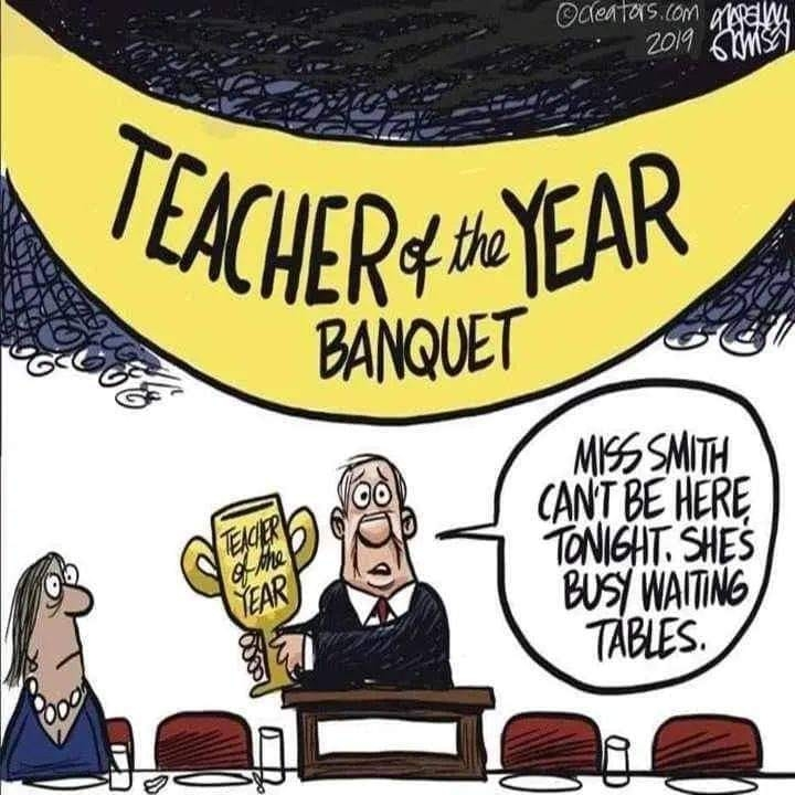 Cartoon/Sermon of the Week  Hiding behind the humor is one of my favorite soapbox topics:  We don’t pay our public school teachers enough!